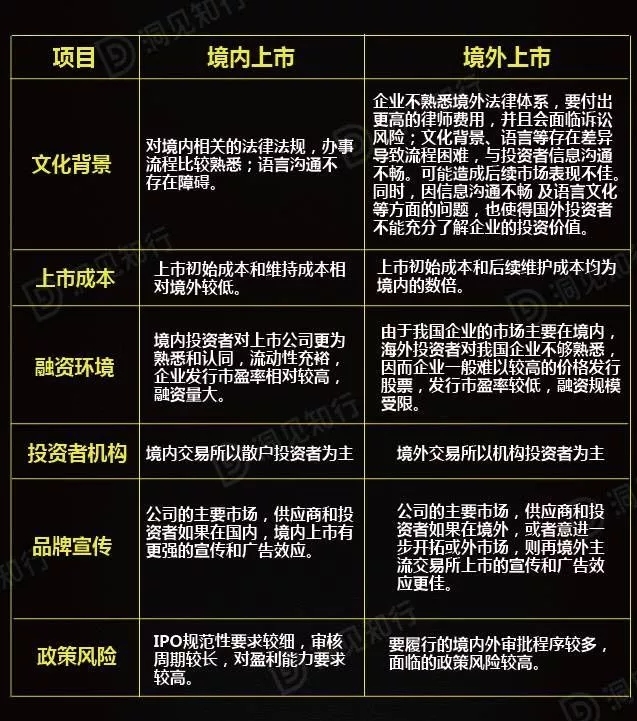 企业选择在境内或者境外上市,应视各自具体情况而定。一般来说,企业在境内或者境外上市主要存在如下差异: