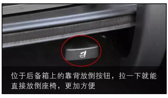 后排座椅放倒的实用性不必多说,能大大提升你的汽车装载能力。而后排座椅放倒按钮的设计比较多样化,小编觉得设置在后备箱内的,是最便利的,这样你在装运大件物品时,就不需要专门跑去后排放倒座椅了。