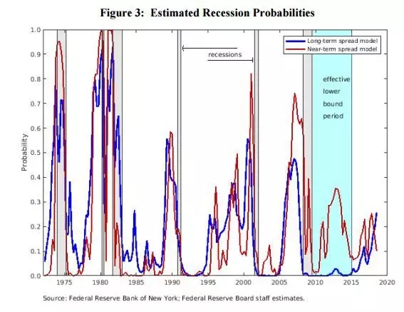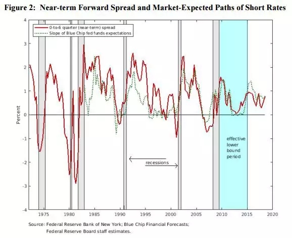 2018年7月,美联储经济学家Eric Engstrom和Steve Sharpe在名为《The Near-Term Forward Yield Spread as a Leading Indicator: A Less Distorted Mirror》的研究文章中指出,美债近期远期收益率息差是一项领先的指标,它反映的是较少被扭曲的实情,相比2年和10年期美债息差这种长期息差,该指标的预测性更强。