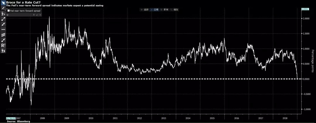 文章称,若该指标转为负值,意味着市场认为“未来多个季度”货币政策会宽松,因为“他们预计决策者要对已发生的衰退或衰退的威胁做出回应”。