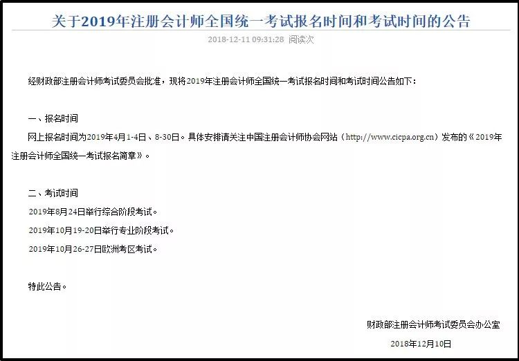 2019年注册会计师考试报名和考试时间公告