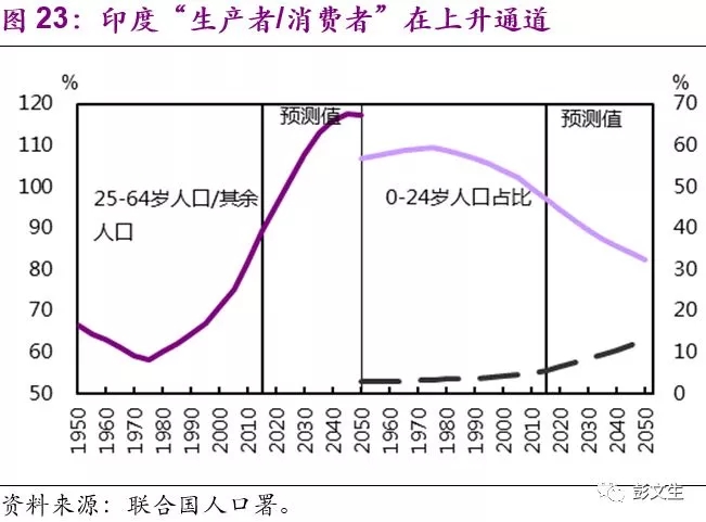 将几个主要经济体的人口结构对比来看,中国“生产者/消费者”拐点刚刚出现,美国拐点出现得相对早些,G7(除美国)人口老龄化进程更进一步,而印度在未来10-20年才将进入人口红利阶段,其经济增长表现是更可期的(图20-23)。一个自然的问题是印度等新兴市场国家的人口红利是否能够弥补中美等老龄化国家的不足,不是完全不可能但不容易,我将在最后一节做些说明。