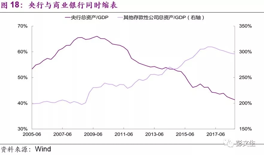 应对信用紧缩带来的经济下行压力和金融风险释放,需要宏观政策的逆周期调节,放松货币、扩张财政。其他国家的经验显示,在金融周期下半场,理想的宏观金融环境呈现“紧信用、松货币、宽财政”的特征。从2017年到现在,中国资本市场的信用利差上升,货币市场利率、无风险利率下降,符合“紧信用、松货币”的方向,但在资金量方面有问题,央行总资产和商业银行总资产对GDP比例都在收缩,同时财政也是紧缩的(图18)。过去一年去杠杆到底出了什么问题?有人说去杠杆太猛了,但力度很难把握,没有无痛苦的调整。和美国、日本去杠杆的经验比较,我们最大的问题是财政和央行资产负债表没有起到对冲和逆周期调节作用。从最近中央经济工作会议的政策表述来看,2019 年财政扩张是大概率事件,宏观金融环境在向“紧信用、松货币、宽财政”的方向发展。