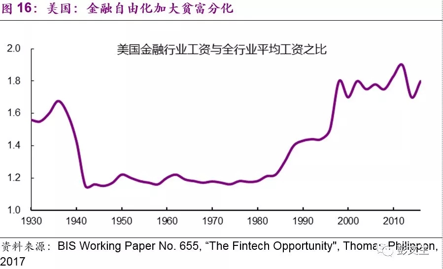 金融周期除了带来金融风险以外,还对经济结构产生影响,并加大贫富差距。贷款的获得有难有易,有先有后。先拿到贷款的占有先机,在价格便宜的时候扩大生产规模,购买资产。有政府信用担保和有地产作为抵押品的借款人占有优势,信贷和房地产天然联系在一起。这就使地产和金融的过度扩张挤压实体经济,加大贫富差距。美国金融行业的从业人员工资和全社会平均工资之比从1930年以来呈“两头高”的态势,两头处于金融自由化的时代,而中间处于金融严格管制时期(图16)。中国没有这方面数据的完整统计,我们团队的研究显示,各个行业实际工资对广义货币的弹性,排第一位的是银行保险,第二位是房地产(图17)。
