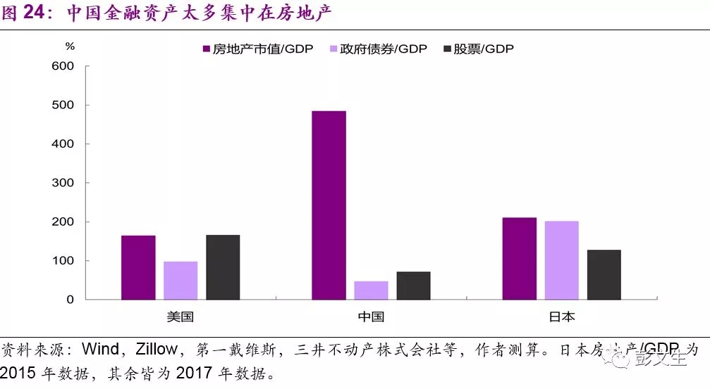养老还有一个财务安排机制,其主要含义是分配问题,老年人通过占有的资产和权益参与年轻人生产的蛋糕的分配。现行养老财务安排机制主要有三种类型。第一类是政府主导的现收现付制,由社会统筹,比如中国的社保。但几乎所有面临老龄化问题的国家都有社保缺口问题,道理很简单,领取养老保障的人在增加,但缴费的人在减少。如何理解社保缺口的宏观含义?社保缺口的本质是当代人的无形资产、下代人的负债,涉及代际分配问题。第二类是基金积累制,养老基金例如美国的401k、中国的年金等,属于当代人的储蓄,带有强迫储蓄的成分,形成资产参与未来的实体产出的分配。第三类是投资房地产,对个人来讲这可能是常见的养老资产,中国尤其如此。和美国、日本比较,中国的房地产在金融资产中的占比突出地高,和GDP 比较,也显示中国房地产的估值极高(图24)。