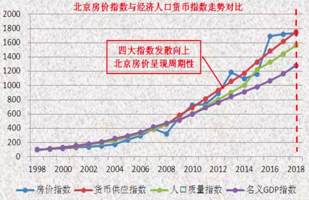 宏观看趋势。北京房价指数、名义GDP指数、货币供应指数以及人口质量指数四大指数呈发散走势。