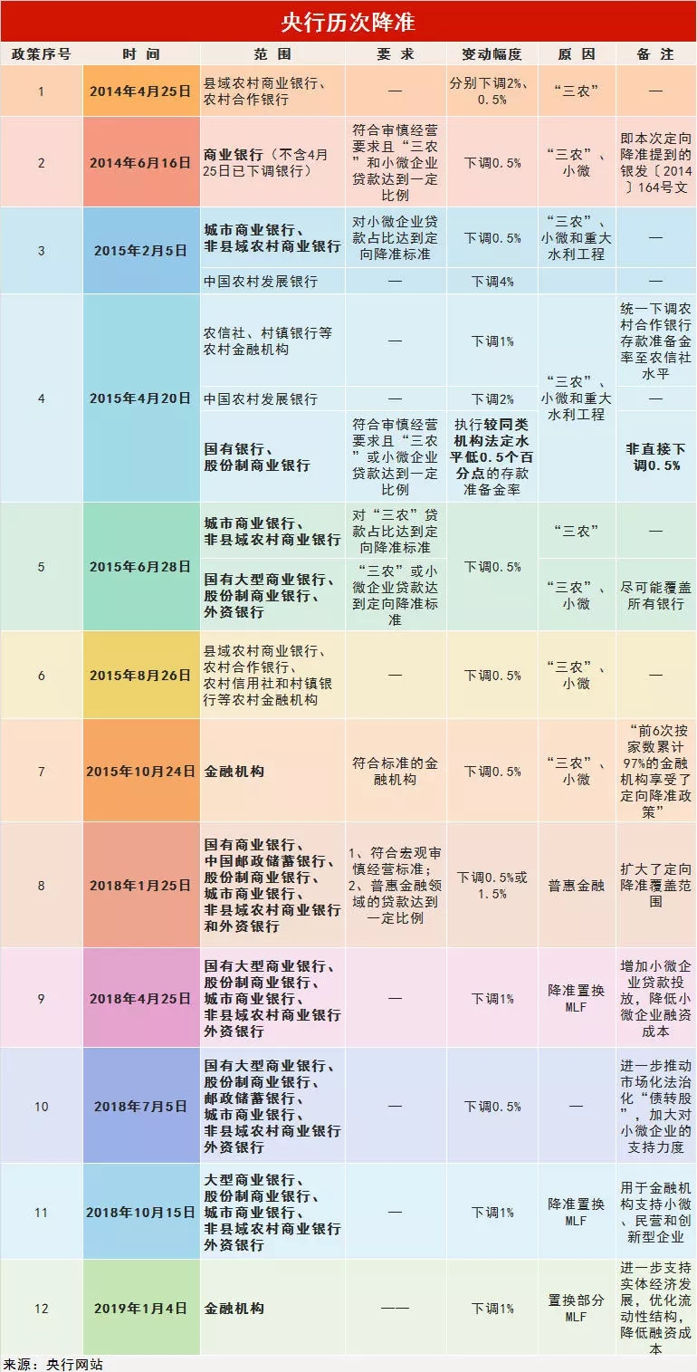 央行1月4日发布消息称,为进一步支持实体经济发展,优化流动性结构,降低融资成本,决定下调金融机构存款准备金率1个百分点,其中,2019年1月15日和1月25日分别下调0.5个百分点。同时,2019年一季度到期的中期借贷便利(MLF)不再续做。这样安排能够基本对冲今年春节前由于现金投放造成的流动性波动,有利于金融机构继续加大对小微企业、民营企业支持力度。