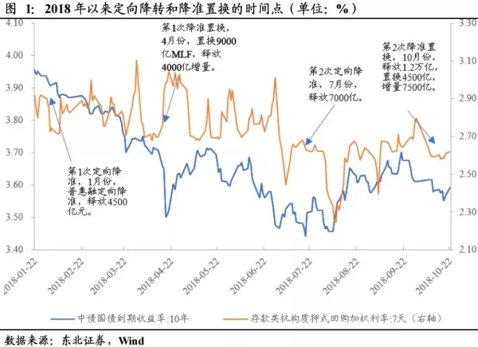 2018年央行已分别进行了2次定向降准、2次降准置换,分别分布在1、4、7、10月。两次降准置换属于央行调控货币政策的一次创新,前期并未有相类似的操作。