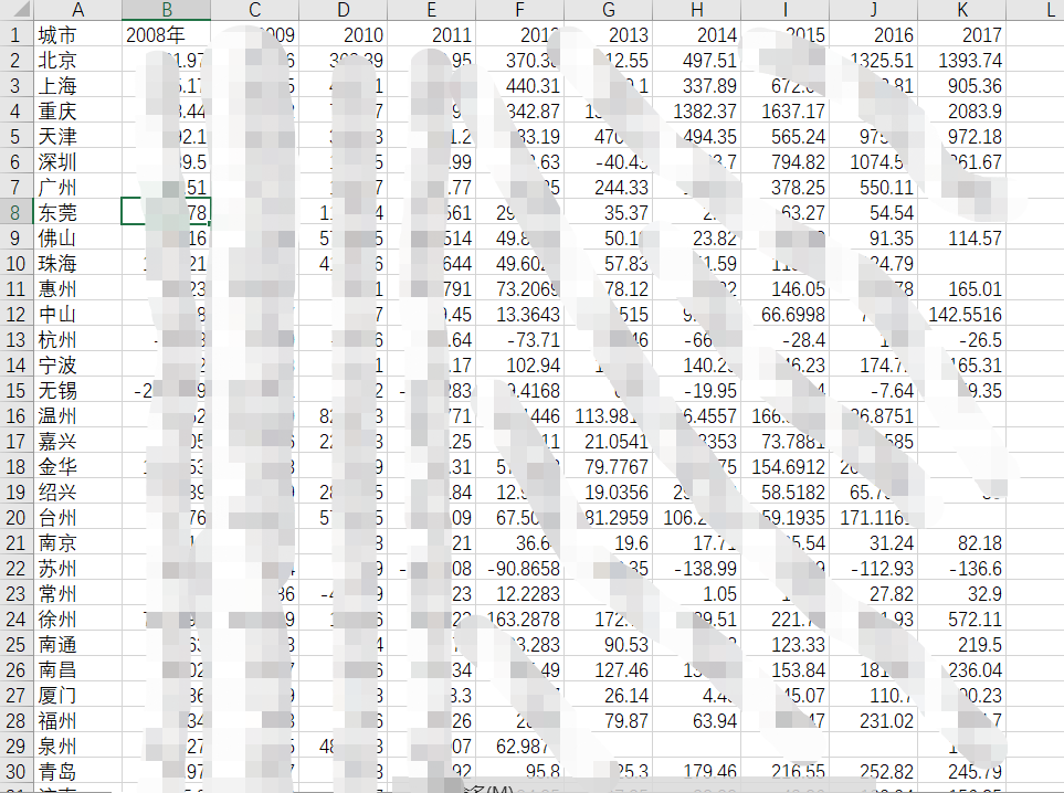 包括以下49个一二线城市的2008~2017年财政赤字数据: