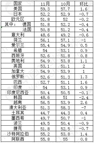 比总体PMI指数,更引人注目的是,这两个PMI指数中的新订单指数都由11月的上涨转为12月的下跌。以下是其他国家PMI指数详情。