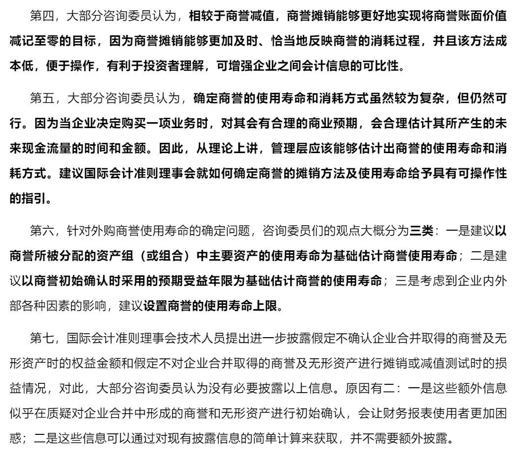 从国际上来看,各国的会计准则对商誉的要求不完全相同。一种是中国会计准则的核算方式,商誉不得摊销,只进行减值测试;第二种是可以摊销,视同无形资产,这也是本次财政部发布的大多数咨询委员的反馈意见;第三种是视同权益抵消项目,合并的时候就与所有者权益进行抵消,减少资产总额。
