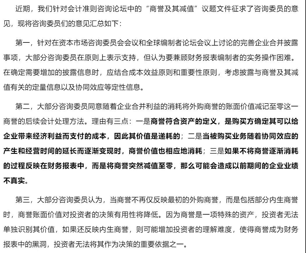 近期,财政部会计司针对“商誉及其减值”议题文件征求了资本市场咨询委员会,大部分咨询委员同意随着企业合并利益的消耗将外购商誉的账面价值减记至零这一商誉的后续会计处理方法。