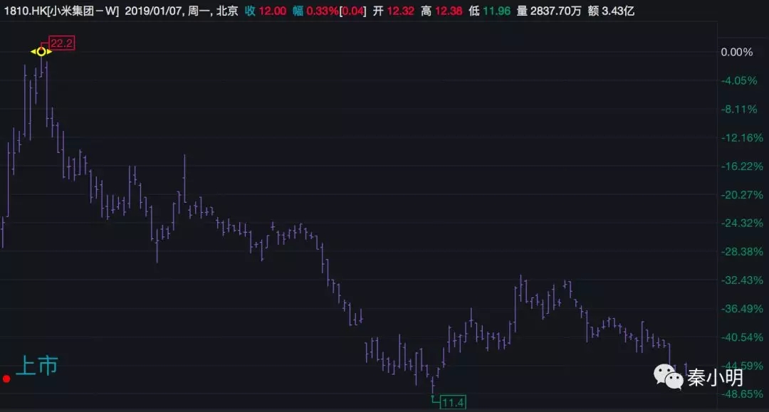 事实上,不仅苹果公司在中国市场表现不佳,我们考察其他本土品牌,一样会得出同样的结论。不妨看看去年中上市的小米公司的股价走势图:
