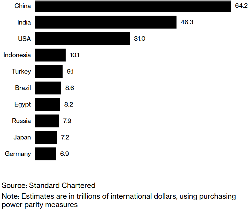 "Our long-term growth forecasts are underpinned by one key principle: countries’ share of world GDP should eventually converge with their share of the world’s population, driven by the convergence of per-capita GDP between advanced and emerging economies," Standard Chartered economists led by David Mann wrote in a note.