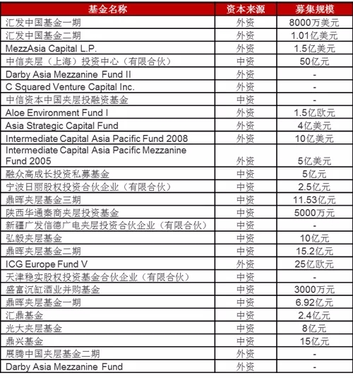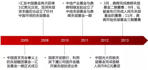 中国的夹层基金从2005年的一支小规模基金汇发基金开始萌芽,经过短时间的发展,已经形成了外资投资机构运作的专业夹层基金、全球性投资银行参与的夹层资本、国内银行参与的夹层资本以及国内专业机构运作的夹层基金共同活跃在市场的局面。目前国内主要私募股权机构如鼎晖、中信产业基金、国开金融、弘毅投资等均已设立了自己的人民币夹层基金或已涉足夹层业务。