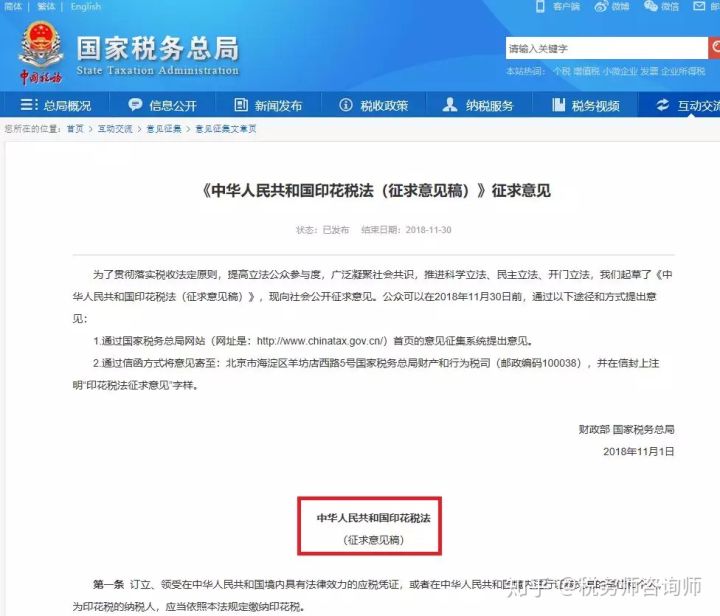 2018年11月1日,中国会计视野讯 财政部、国家税务总局起草了《中华人民共和国印花税法(征求意见稿)》,意见稿中主要内容中包含对少部分税目的税率进行了适当的调整,规定了六种免税情形等,修改的知识点不对,但都比较细致,考生需要适当了解。