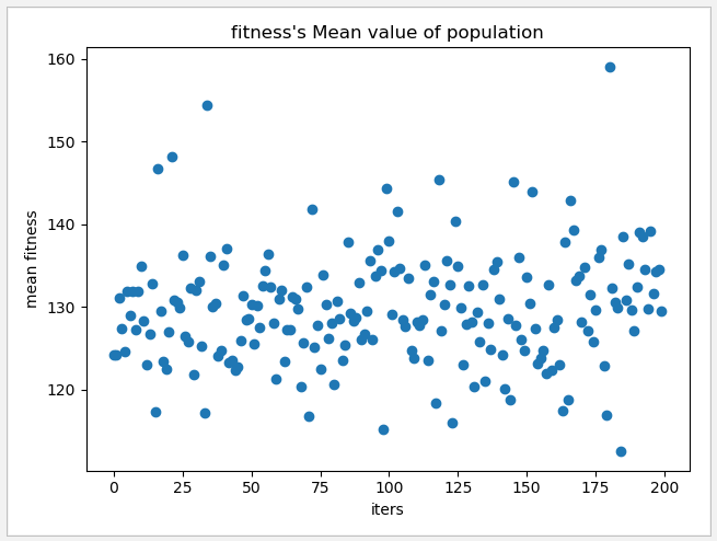 按照遗传算法的思想,随着种群的迭代更新,种群的平均适应度是不是应该有明显的提升?但是我做了一个例子,结果是这样的,虽然最终经过200次迭代找到了最优解。但是为啥种群的平均适应度没有明显提升。