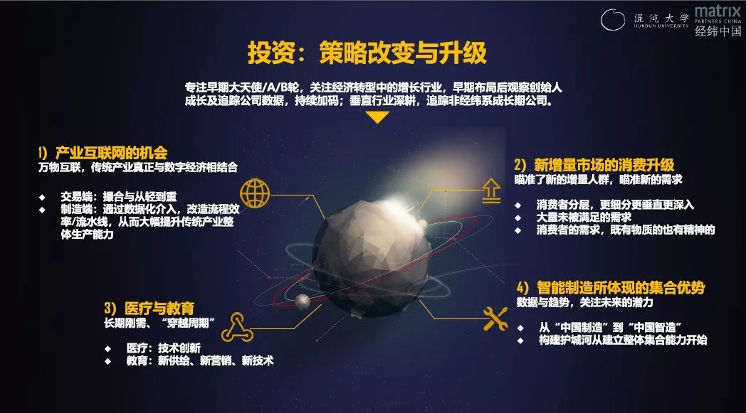 从2014年到今天,ToC的APP相关的消费互联网项目,占我们投资总量的15%不到。我们现在重仓的是产业互联网、新增量市场的消费升级、医疗与教育、智能制造、与应用场景结合的新技术等领域。