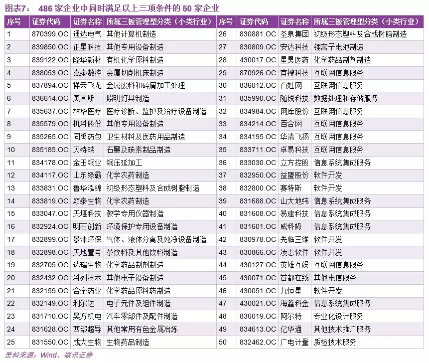 以上我们对新三板企业的筛选中,并没有针对公司行业、具体业务、研发能力、机构投资等方面的因素进行考量。基于以上486家企业的名单,我们从中选取了同时满足以下三项条件的企业: