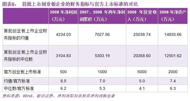以创业板设立之初为例,我们将2009年10月30日第一批上市企业的净利润、营业收入和净资产等财务指标的中位数和官方上市标准进行对比,可以发现:
