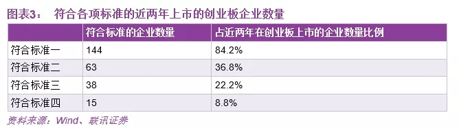同时符合科创板四项标准的创业板企业共3家、同时符合三项的有36家、同时符合两项的有35家、符合一项标准的有70家,合计共144家,占近两年创业板上市的企业总数(171家)的96%。
