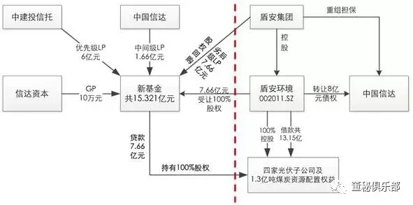 再看上图的左半边,对四家光伏子公司股权的处理。中国信达、信达资本、中建投信托、盾安集团共同设立了一个基金共15.321亿元,以其中7.66亿元受让了这四家子公司100%的股权;另外7.66亿元,委托中建投发放信托贷款给内蒙古盾安光伏。