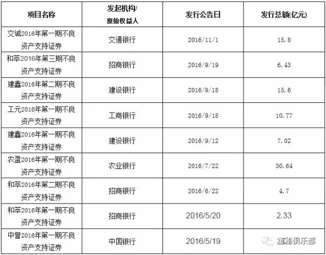 2016年,银监会相继出台了多项政策封堵银行不良贷款假出表,因此银行对有较强动力通过包括不良资产证券化在内的方式改善自身资产负债表。2016年上半年央行牵头各部委出台了多个文件以推动资产证券化发展,同时银监会批准6家银行(五大行+招行)成为不良ABS试点单位,截止目前,6家试点银行均已发行不良资产ABS产品,合计规模近100亿,基础资产涉及对公贷款、个人住房贷款、信用卡贷款、承兑汇票垫款等。