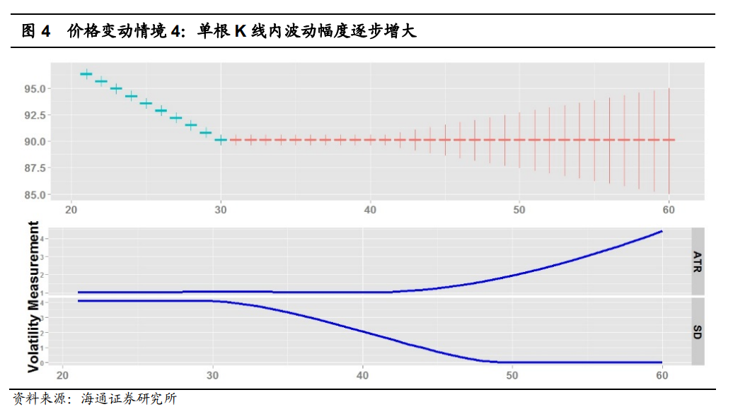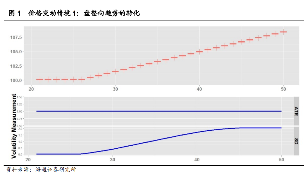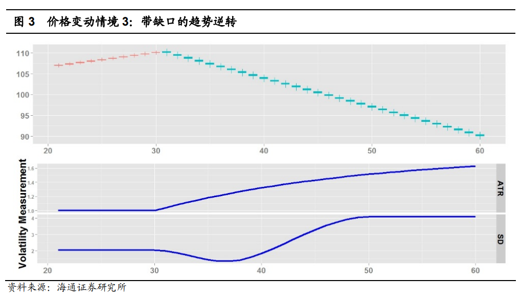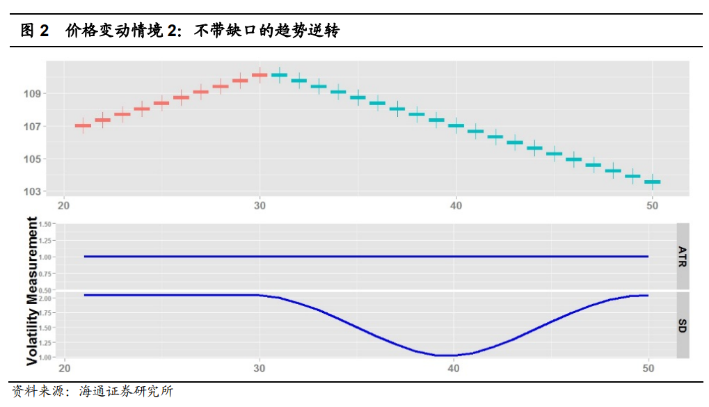 海通证券测试了ATR和标准差的性能差异,这四种情况虽然特殊,但是以极端方式,体现了标准差和ATR的区别。