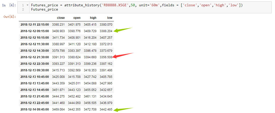 之后我们和聚宽技术客服沟通了解到:使用get_bars函数能够更好地获取到每天都是9点开始的数据,这样使用较大粒度的K线,如1小时线,也可以完成拼接,且效率更高。