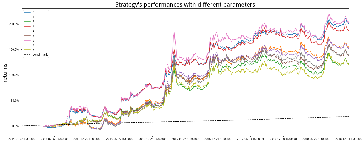 模型中其他逻辑都比较简单易懂,所以搞懂此部分,基本上就能完成计算所需的数据支撑。下面我们进行参数组合测试,发现全过程表现较优质的参数。因为数据拼接涉及到IO量大,计算速度较慢,所以我建议从2014年测试,且如果你想要得到一个完整、可信度高的参数表现,要和之前测试动量模型一样,测试大约25个以上的品种。