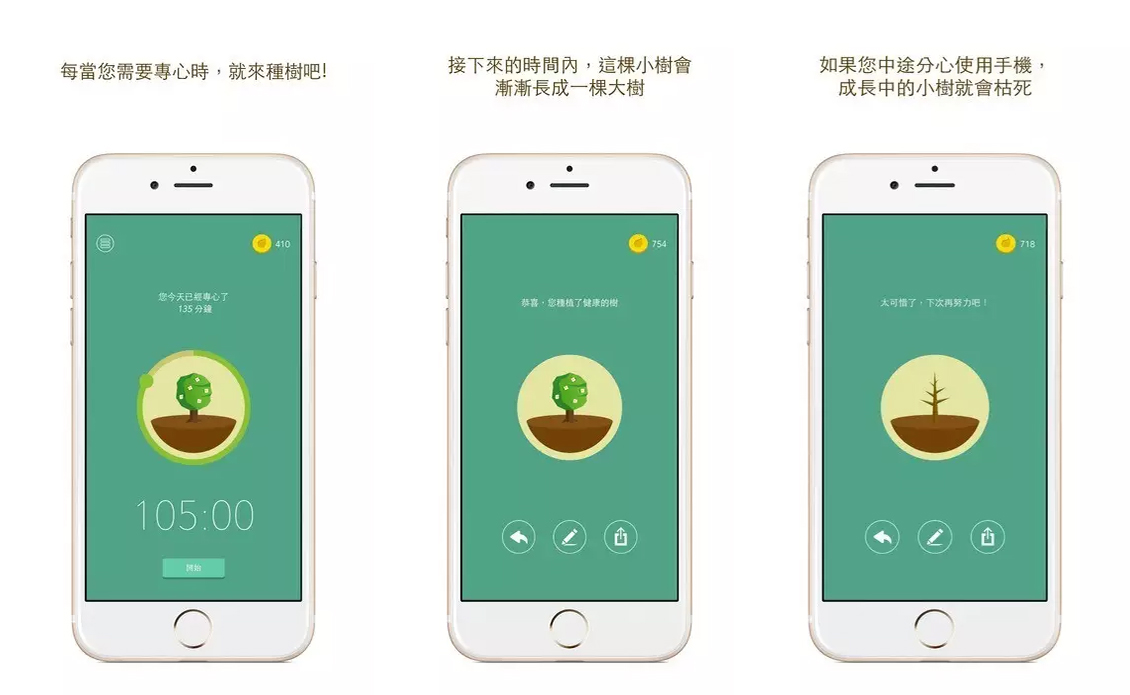 每次开启一个25分钟的专注时间,你就开始种一棵树,如果这个过程中你去碰手机,这个树就枯死。