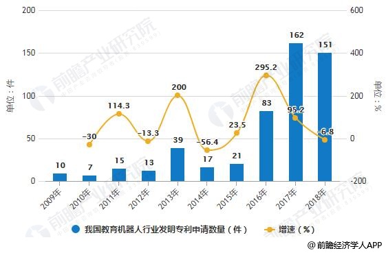 2009-2018年中国教育机器人行业专利申请数量统计及增长情况