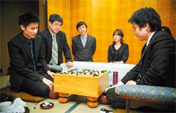 棋逢对手 ▲日本棋圣挑战赛张栩(左一)击败对手山下敬吾(右一)拿下首场胜利后,台湾旅日棋手王立诚(左二)与王铭琬(左三),进入赛场进行复棋,检讨得失。(郑任南摄)
