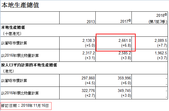 去年11月,香港政府将2017年全年名义GDP从26626.37亿港元修正为26610亿港元,名义增速6.8%,实际增速3.8%。