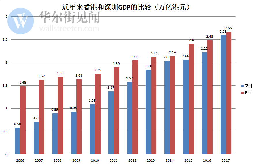(制图:华尔街见闻 数据来源:深圳统计局、香港特区统计处,其中2017年深圳GDP按照2017年人民币兑港币平均汇率1.1552计算)