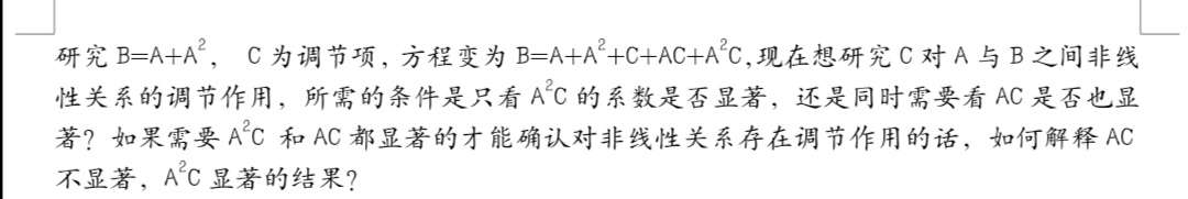 研究B=A+A2,  C为调节项,方程变为B=A+A2+C+AC+A2C,现在想研究C对A与B之间非线性关系的调节作用,所需的条件是只看A2C的系数是否显著,还是同时需要看AC是否也显著?如果需要A2C 和AC都显著的才能确认对非线性关系存在调节作用的话,如何解释AC不显著,A2C显著的结果?   这里的2是指平方项