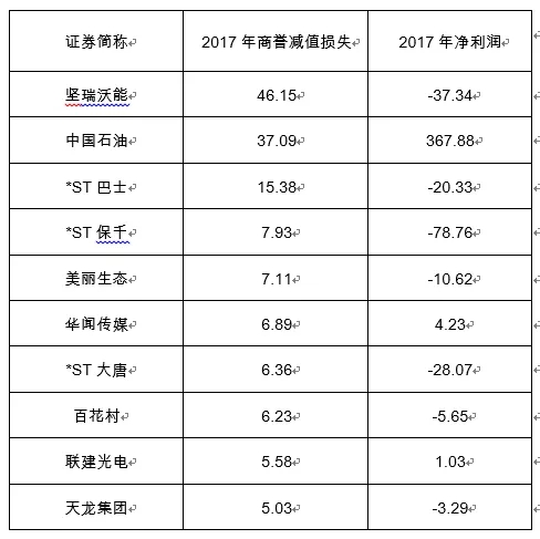 以2017年为例,统计上市公司前50家最大的商誉价值数额,高达为255.058亿,平均一家5亿以上。从排名来看,分列前10的分别为坚瑞沃能46.15亿、中国石油37.09亿、*ST巴士15.38亿、*ST保千里7.93亿、美丽生态7.11亿、华闻传媒6.89亿、*ST大唐6.36亿、百花村6.23亿、联建光电5.58亿、天龙集团4.96亿。仅这10家上市公司就合计发生高达143.67亿的商誉减值,同期扣除中国石油,实现净利润亏损179亿元。