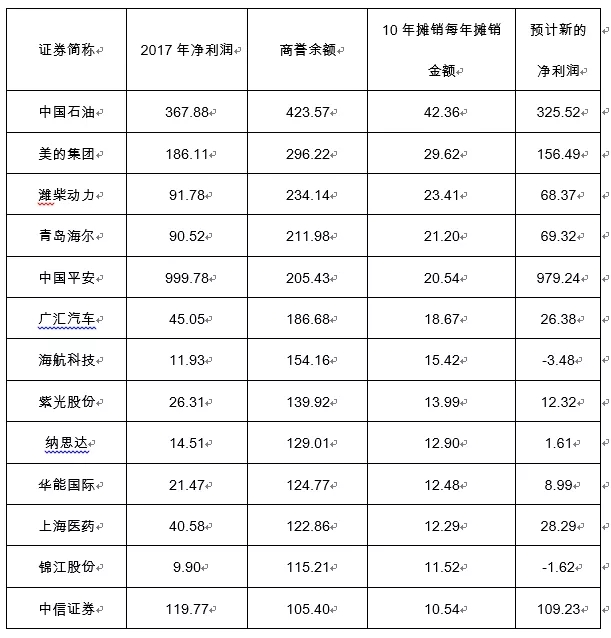 初善君根据商誉余额进行测算,如果按照10年摊销,将有376家商誉摊销金额大于1亿元,新增亏损上市公司不低于200家,也就意味着无数的公司要面临连续亏损乃至退市,毕竟商誉摊销可以持续十年,这个利润减少的窟窿没法弥补。其中下面公司的净利润将减少10亿以上,而海航科技、锦江股份将由盈利超过10亿而直接亏损。