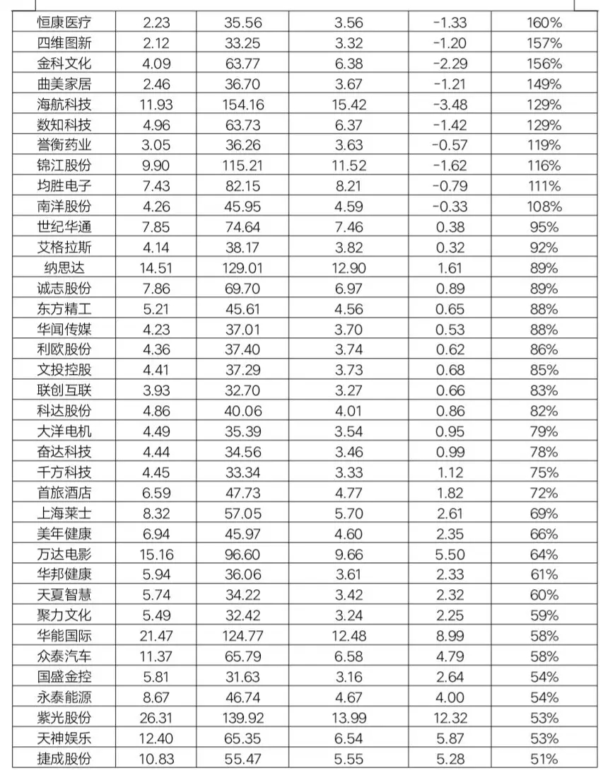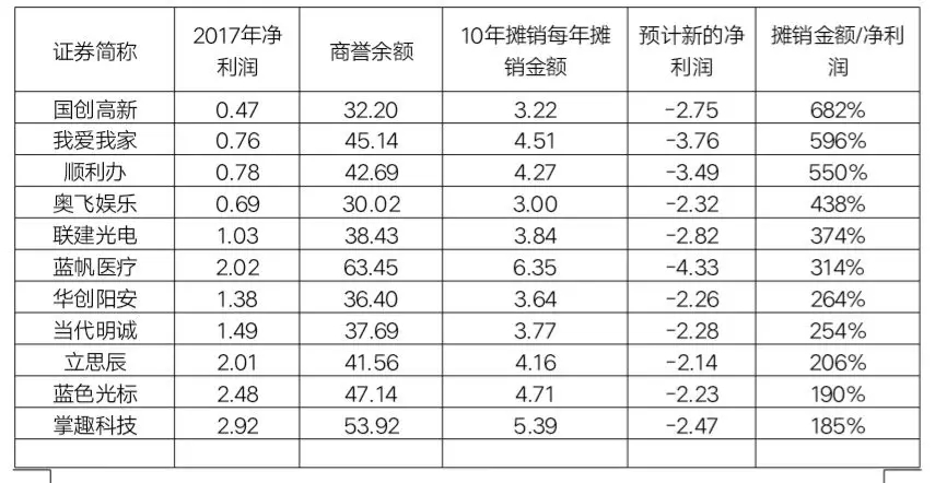 而从摊销金额/净利润的比例来看,以下公司的净利润降幅最可怕,其中有21家公司直接由盈利变成亏损,共计48家公司净利润至少减半,这些公司都是需要投资者需要规避的风险。