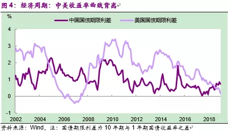 从经济周期来说,中美的收益率曲线有一些不同,美国的国债期限利差是下降的,而中国的国债期限利差是上升的且为正(图4)。大家可能有一点奇怪,不是不看好中国经济吗?为什么收益率曲线斜率为正?其实这并不奇怪,收益率曲线向上倾斜都是在货币政策放松的阶段,这时候对经济的长期预期改善,进而呈现这一形态。所以一般来讲,收益率曲线倒挂发生在衰退没发生前,向上是在复苏没发生之前。美国收益率曲线倒挂,预示着未来的美国经济可能进入衰退。但对中国来讲,我们的国债市场流动性是不是足够高、是不是有足够的深度和广度,使得收益率曲线对未来的经济有前瞻性,这是值得研究的。但总体来讲,中美两国短周期的货币环境面临不一样的态势。