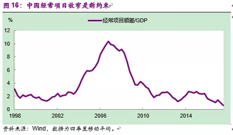 就人民币汇率而言,在金融周期和经济周期下行阶段,货币放松支持总需求的一个渠道就是汇率贬值,刺激出口。同时,汇率贬值也有利于抵消贸易摩擦比如对方关税增加的影响。我们需要关注和过去不一样的新增因素,就是经常项目顺差已经快到零了(图16)。在外需弱、通过扩大内需稳增长的情况下,一个可能结果是我们很快将看到经常项目逆差。如果经常项目和资本项目都是逆差,那么汇率贬值的压力就大了。