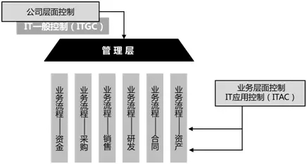 按照风险及控制所作用层面的不同,实施风险控制体系可以分为公司层面控制、IT一般控制、业务层面控制和IT应用控制四个方面的建设。它们的关系如图7所示。