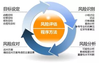 风险评估是风险防控过程不可或缺的手段,它是我们认识、评断风险,并由此推导处置手段最直接的策略方法。风险评估主要经过目标设定、风险识别、风险分析和风险应对四个基本程序,其一般程序和方法如下: