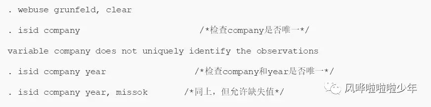 一般而言,每个数据集都有唯一一个识别每条记录的识别符(重复测量的长型数据除外)。Stata检查唯一识别符是否唯一的命令为isid(或许是is this an ID的缩写)。isid允许同时检查多个唯一识别符,如果没有返回值,就说明是唯一的(没有消息就是好消息);如果不唯一,就会出现红色提示variable *** does not uniquely identify the observations。如采用下面例子中的查重方式: