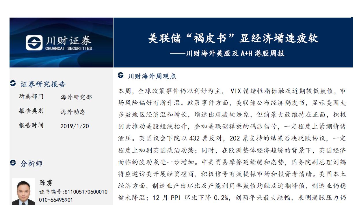 川财证券-海外美股及A H港股周报:美联储“褐皮书”显经济增速疲软-190120.pdf