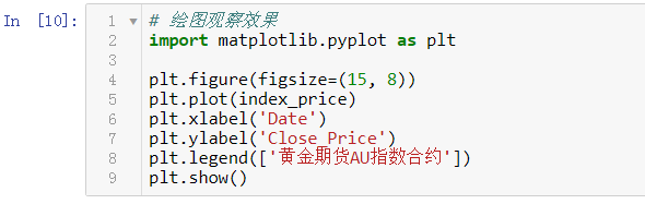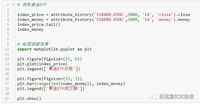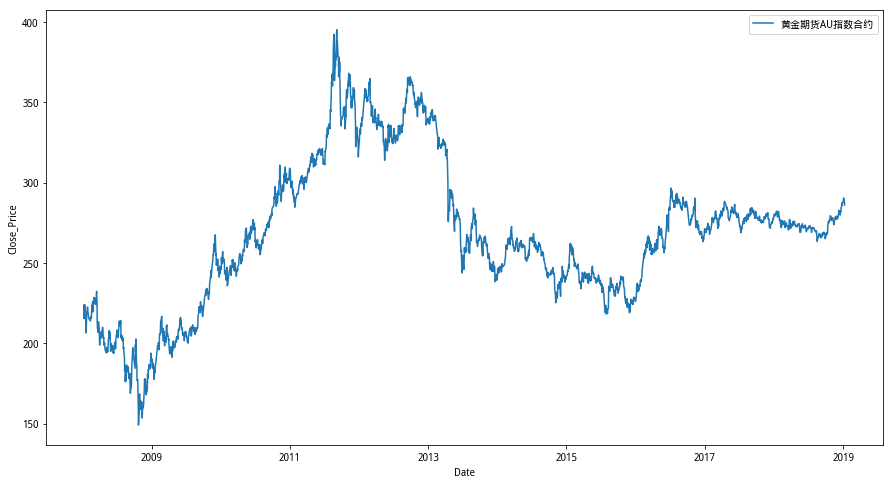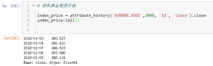 通过简单的一行代码,即可在聚宽平台调取上海期货交易所的黄金期货价格,这里我们选择AU8888指数合约进行展示,获取过去3000个交易日的close收盘价字段,足矣覆盖2008年初时间段。
