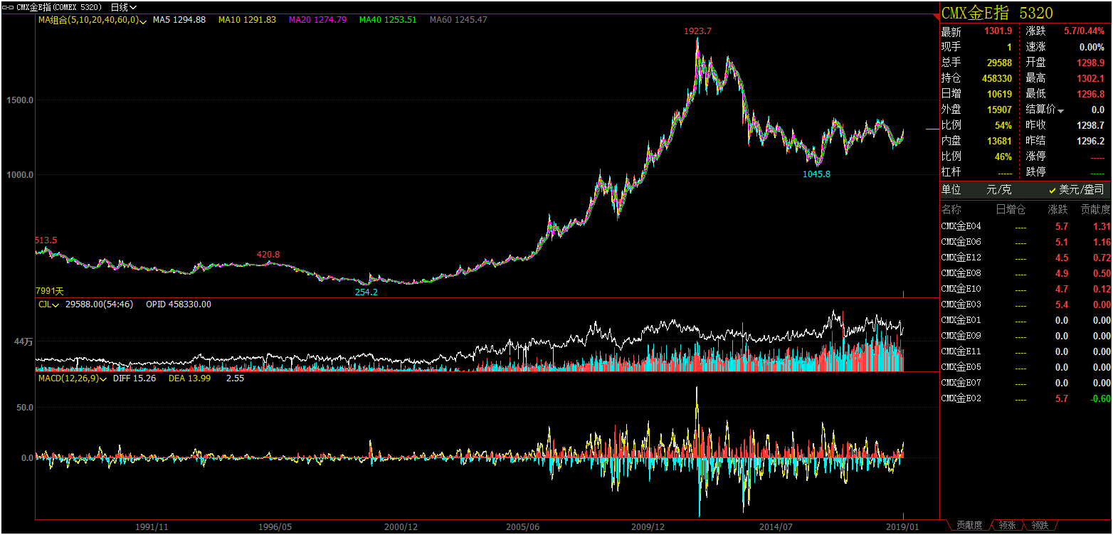 因为国内黄金期货上市时间较短,和纽约CMX不同(CMX金通过文华财经等软件可以取到1987年的数据),我们的黄金期货于2008年初上市。