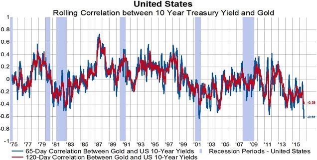 黄金具有天然的避险属性,其价格走势跟市场的避险情绪正相关。自从1974年开始,黄金和美国十年期国债之间的65日移动相关曲线平均值为0,也就是说,通常这二者没有任何相关性。