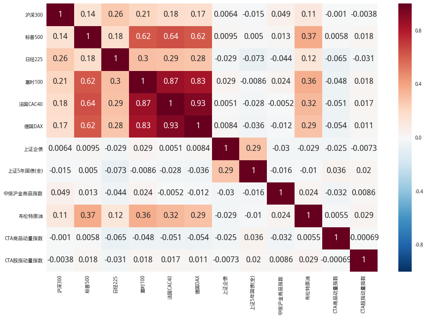 沪深300、中证500、恒生指数、标普500、纳斯达克指数、富时100、法国CAC50、德国DAX、日经225、上证5年国债、上证企债、中信沪金商品指数、布伦特原油等多种类资产,涵盖全球主要股票市场、国内债券、国内外商品等。选取2009年1月至2018年9月期间上述指数的收盘价数据,并统一以A股市场交易日为准。