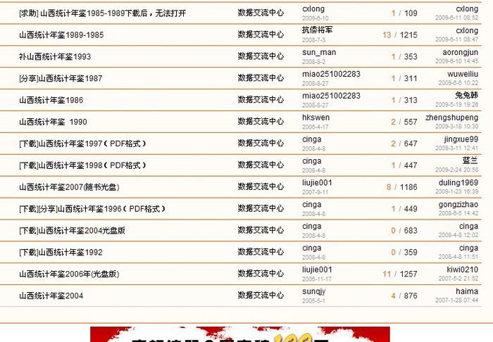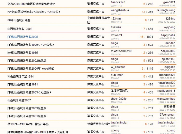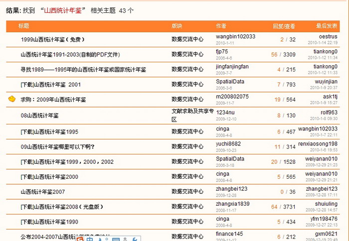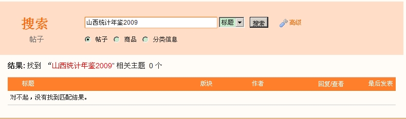 刚才又是这样,我上传了山西统计年鉴2009,不多会,首发贴的楼主就跟帖告诉我这个帖子重复了。这时,我再一次搜索,还是搜索不到(包括我自己上传的,见截图),这到底是怎么回事?